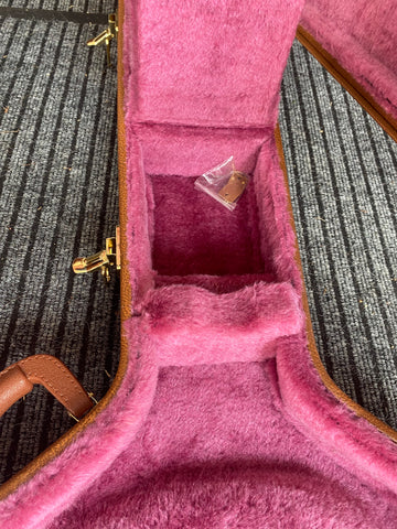 A really nice tan leatherette guitar case for 335s and other semi acoustic guitars with a lush dusky pink interior - Internal dimensions 110cm long x 42cm widest x 33cm shoulder see pictures